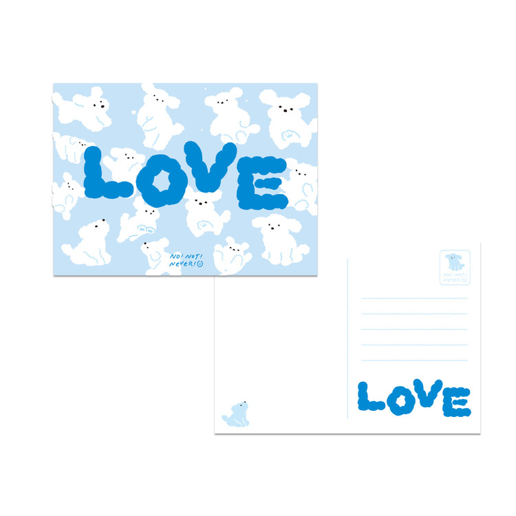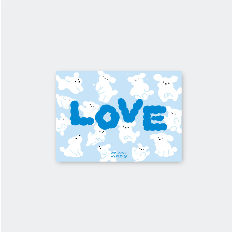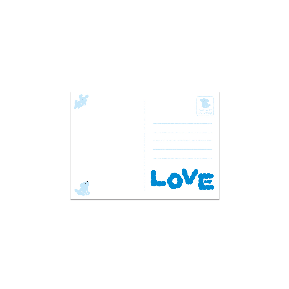구름을 닮은 노낫네버의 대표 캐릭터 뭉개가 가득찬 맑은 하늘 같은 엽서입니다.