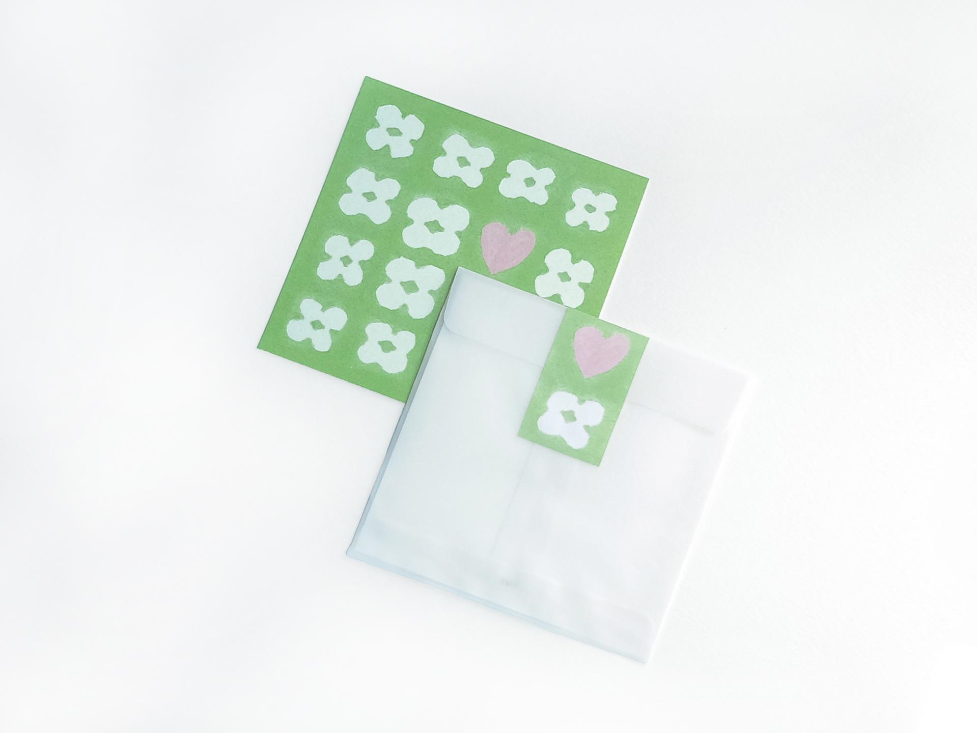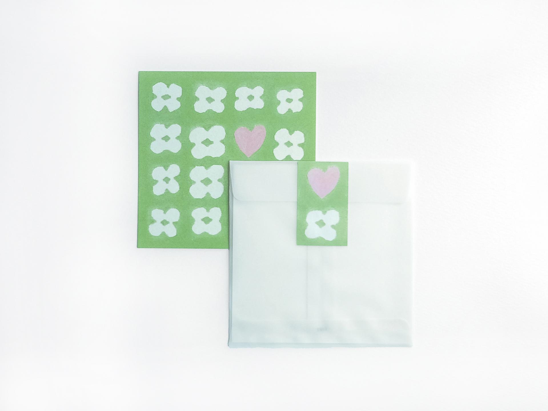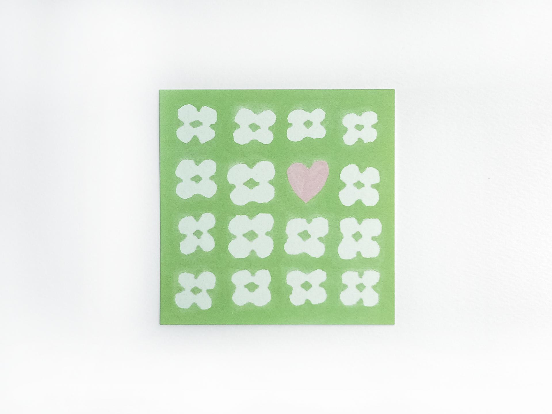 클로버로 가득 찬 편지 속 작은 하트가 돋보이는 엽서입니다.