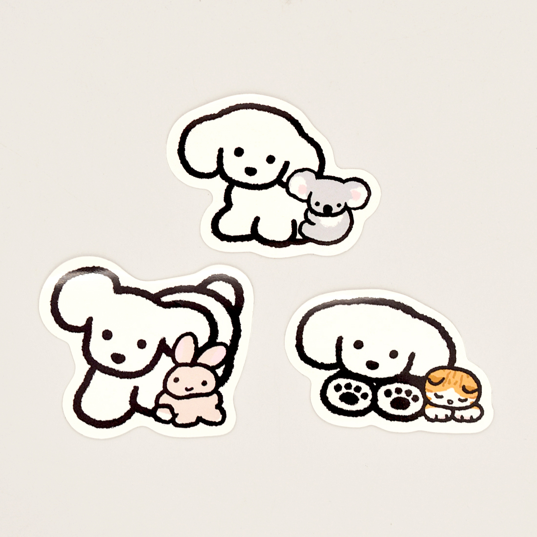 테라오카씨가 그린 강아지에 다정하게 달라붙은 코알라, 토끼, 고양이의 모습이 사랑스럽고 마음을 간질입니다.